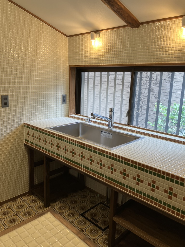 当店の施工ではタイルばかり貼っていますが、それはレトロでかわいいから、だけではありません。タイルはまず丈夫で頑丈。焼き物なので火に水に強い。そして釉薬がかかっているので汚れが中まで入り込むことはなく、お手入れも実は簡単。とくに油汚れなんてとっても落ちやすいんですよ!