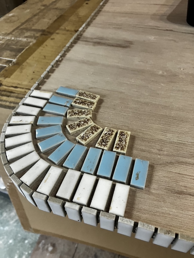 ↑丸いテーブルの縁や角アールのテーブルの縁に貼っているのはこれまたもう生産中止になってしまった50角の半分の細目のタイル 八分半丁。細いので曲がっている部分にピッタリハマるのです。