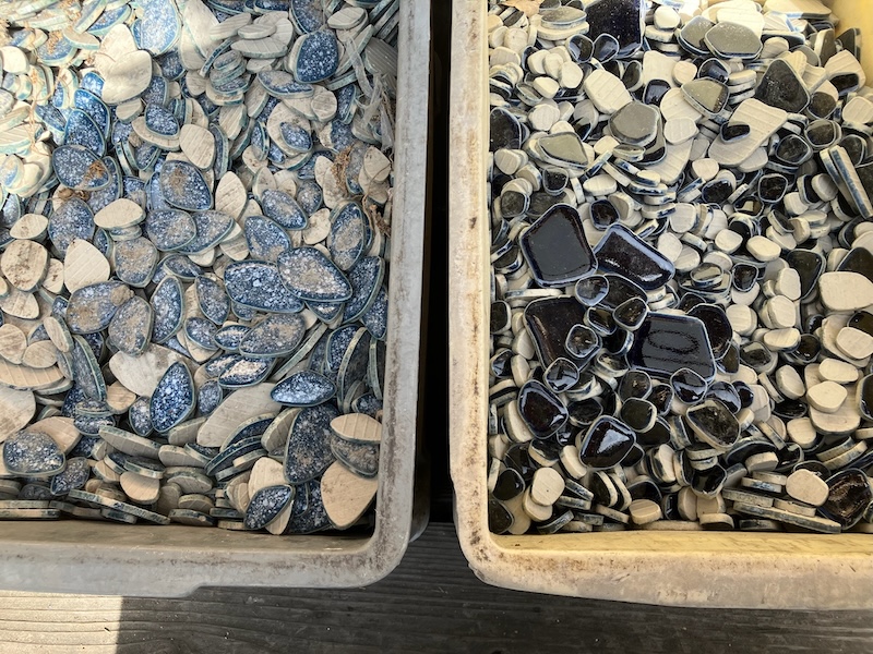 この三角の角がないタイルは玉石(たまいし)といわれ、四角いタイルと違って目地をまっすぐ整える必要もなく角がないで丸いものや角がないものに貼りやすいことから水回りなどでとても使われたタイル。これらはアール部分や曲面にも貼れるため、水回りのシンクやお風呂、台所などでよくつかわれてきた所以なのです。