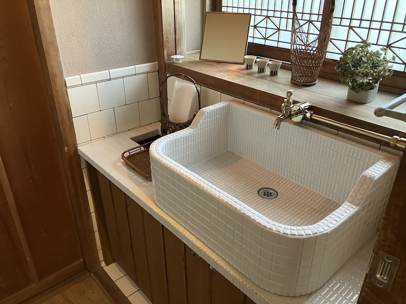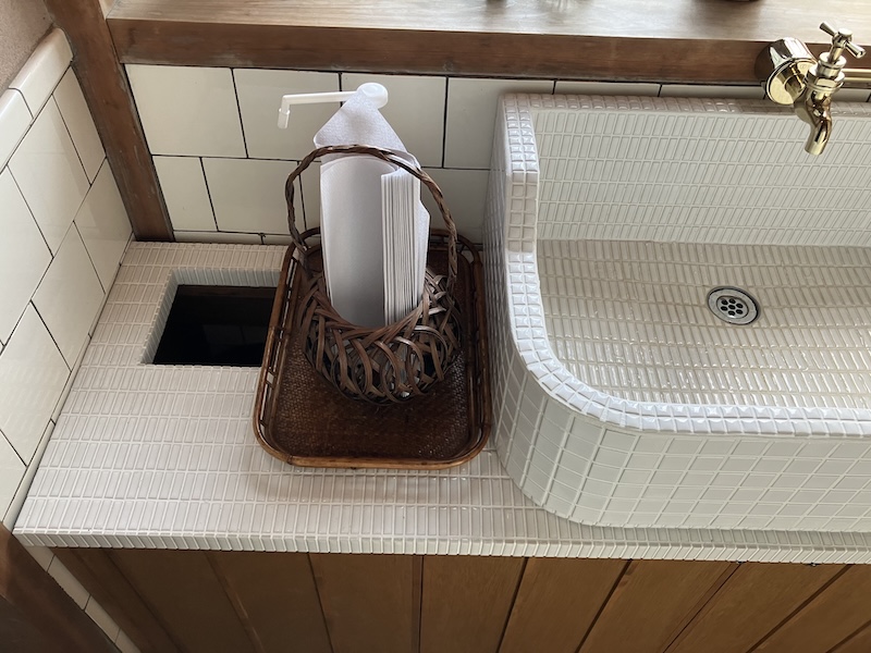 古民家を古民家らしく戻す、がテーマだったので、この手洗いスペースには色をいれず白で統一。タイルシンクの作善堂さんにシンク製作はお願いしたのですが、作善堂さんのカフラフルさは一歳入れず、真っ白に。ただ、定番の正方形のモザイクタイルではなく、よりレトロ感のでる細長いタイルを使っていただくよう別注しました。なぜなら古民家の昔の水回りでは白いタイルだけが使われていることも多く、あえて色をいれない選択をしたわけです。