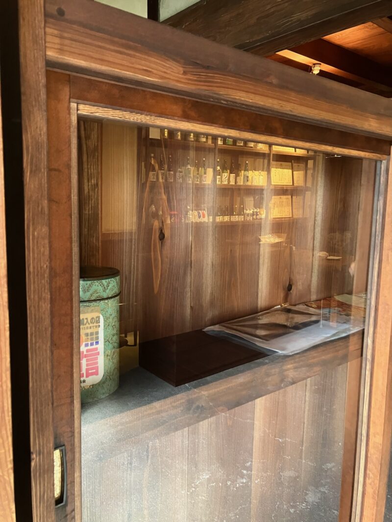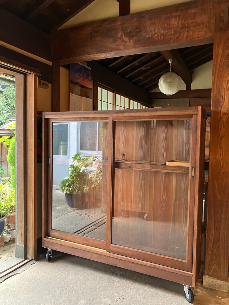 プラス、扉となるガラス戸の枠も古い建具を分解して再利用しました。もともと建具に使われている木はまっすぐで厚みもあり、堅木が使われているので、木として優秀ですし、引手や木の表情にも味わいがあるので、150年の歴史ある酒蔵にすっと馴染む水屋什器が完成しました。