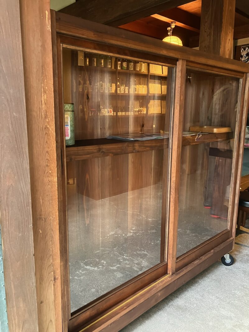 プラス、扉となるガラス戸の枠も古い建具を分解して再利用しました。もともと建具に使われている木はまっすぐで厚みもあり、堅木が使われているので、木として優秀ですし、引手や木の表情にも味わいがあるので、150年の歴史ある酒蔵にすっと馴染む水屋什器が完成しました。