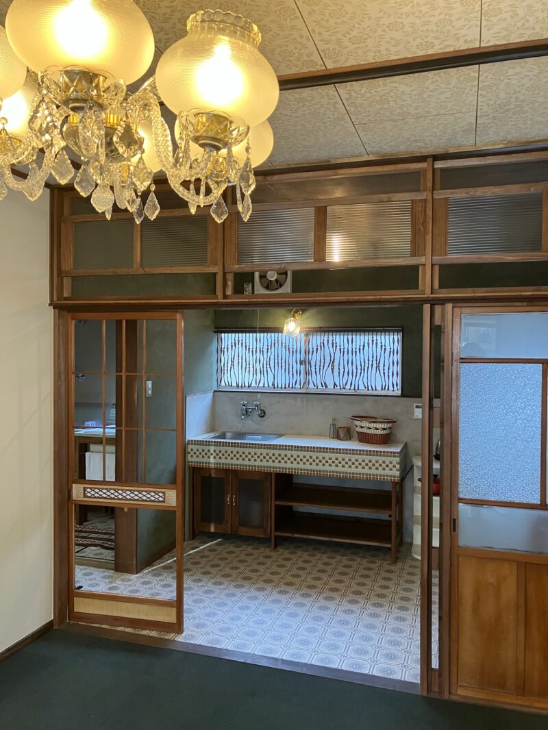 キッチン手前の元応接間に残っていたガラスのシャンデリアも再利用。