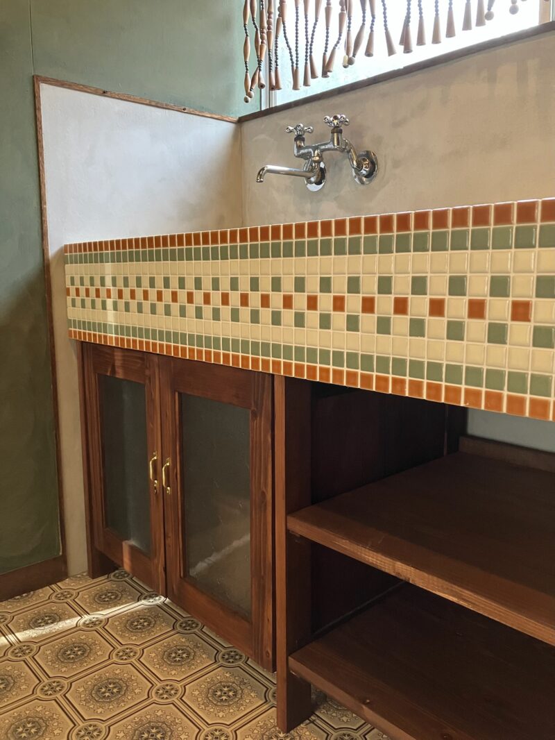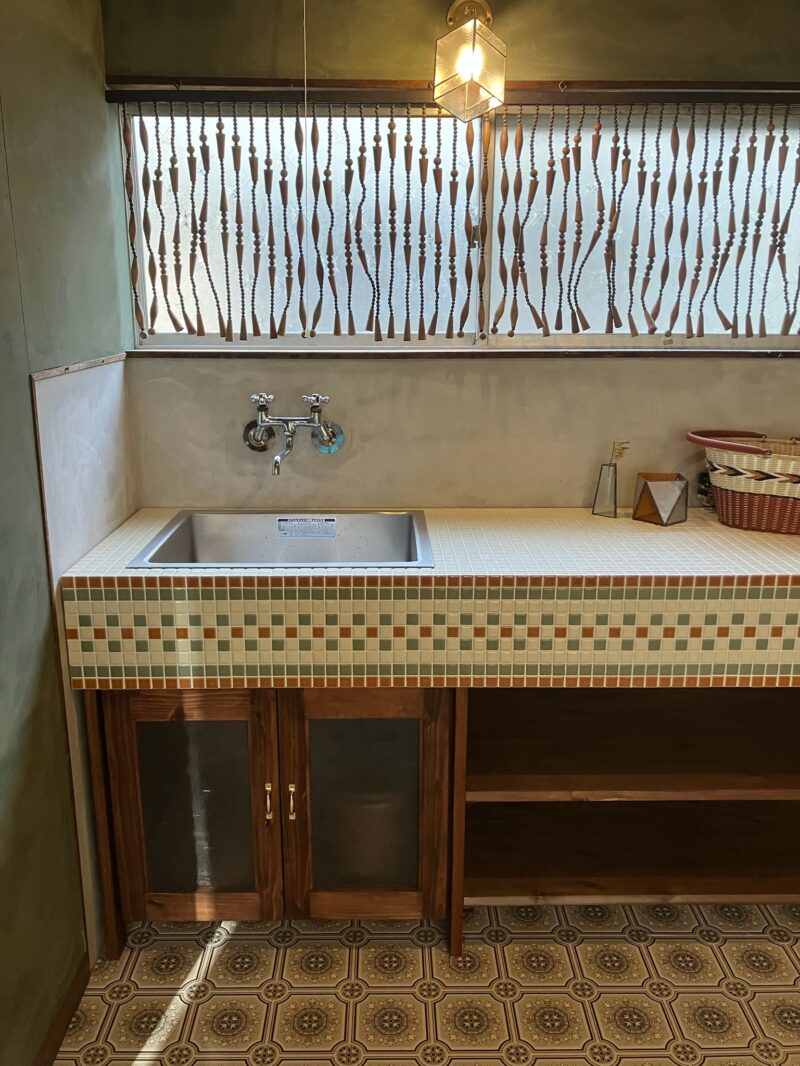 昭和レトロガラスを再利用して照明や雑貨を制作するkazejunさんの工房のキッチンをつくらせていただきました。工房の物件自体も昭和レトロ。そちらをリノベーションし、住まいじゃないのでなにか面白いキッチンを配したい、とのことで当店のオリジナル昭和レトロタイルキッチンを選んでいただきました。モザイクタイルの楽しいところは色を組み合わせてオリジナルの柄が作れるところ。今回は正面の帯に一松柄をあしらいました。