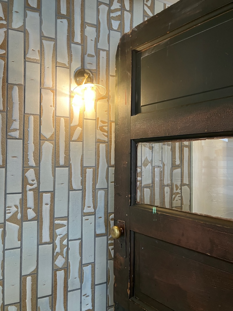 焼き菓子のようなタイルをあしらって。手作りのパンと愛通ずるタイル。この深緑のドアは以前食パンラックの背板に使われてました。ドアは以前什器の背景でつかっていたアンティークドアを今回は本当にドアとして活用しました。